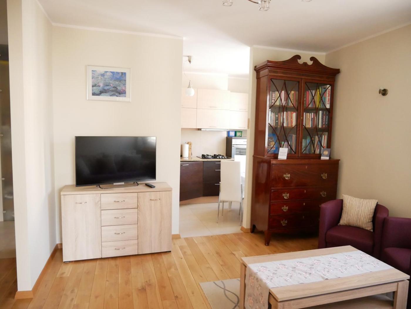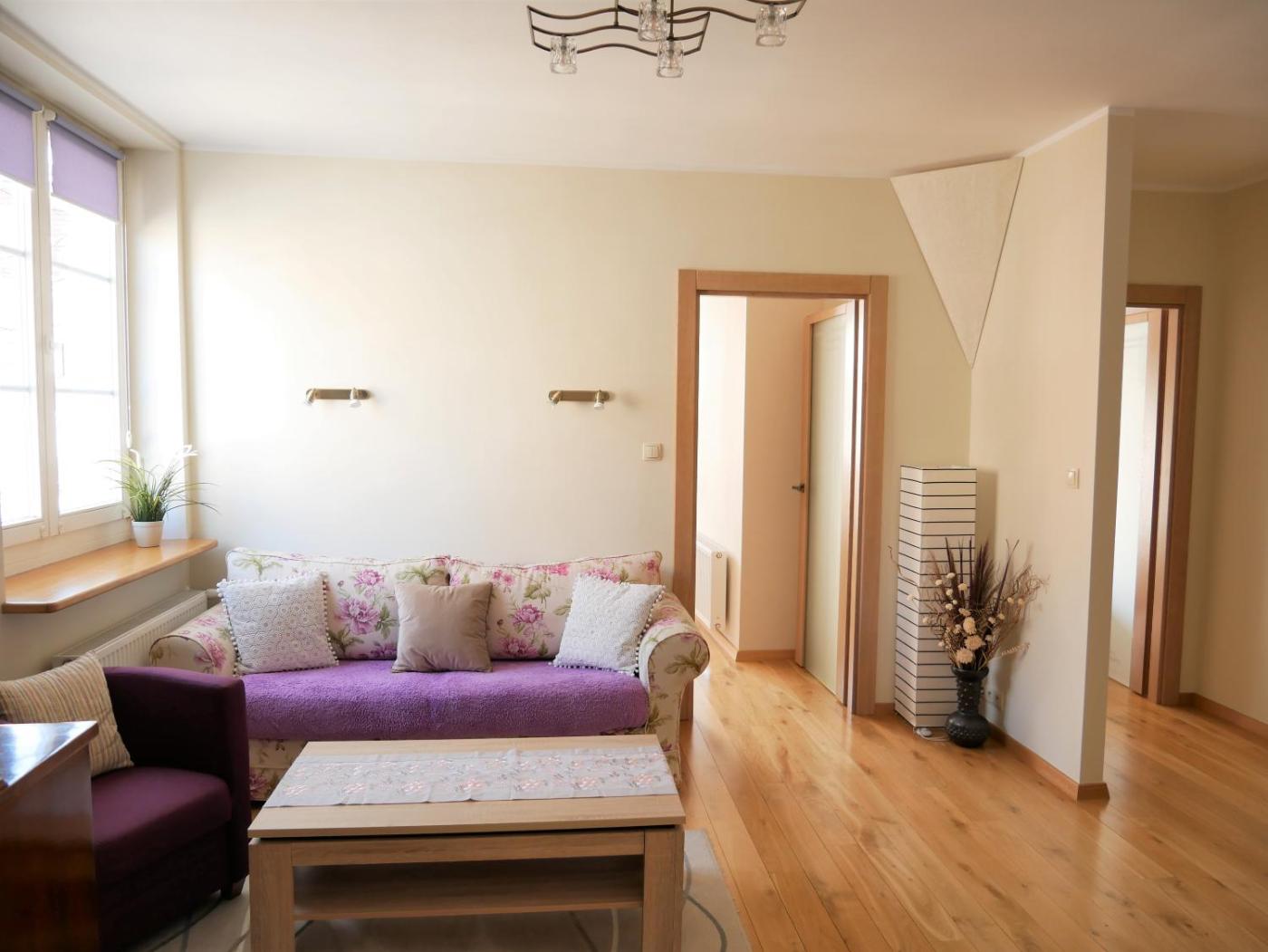 Apartament z 2 sypialniami. Featuring a private entrance, this apartment comprises 1 living room, 2 separate bedrooms and 1 bathroom with a bath and a shower. The well-fitted kitchen features a stovetop, a refrigerator, a dishwasher and kitchenware. The apartment provides a flat-screen TV, a washing machine, soundproof walls, a tea and coffee maker as well as garden views. The unit offers 3 beds. Apartament - 5 osobowy. Powierzchnia pokoju ok.: 60 mkw.
